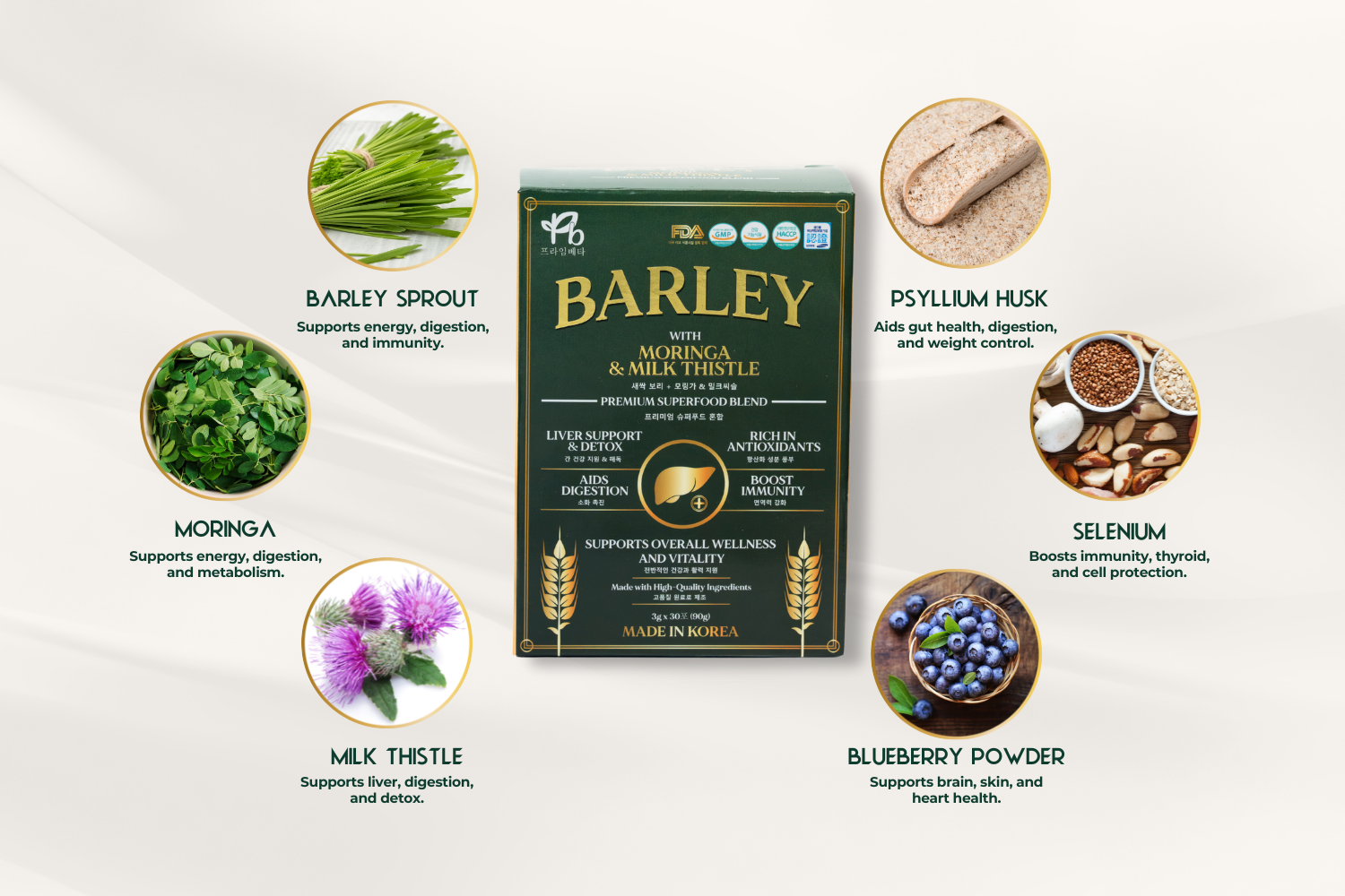 Primebeta Barley is a superfood drink blend made from 100% young barley grass, combined with Moringa, Milk Thistle, Selenium, Psyllium Husk, and Blueberry (powder and concentrate). This unique formula is designed to detoxify the body, support liver and gut health, boost immunity, and promote radiant skin and overall wellness. It’s your all-in-one daily drink to help you feel lighter, stronger, and healthier.