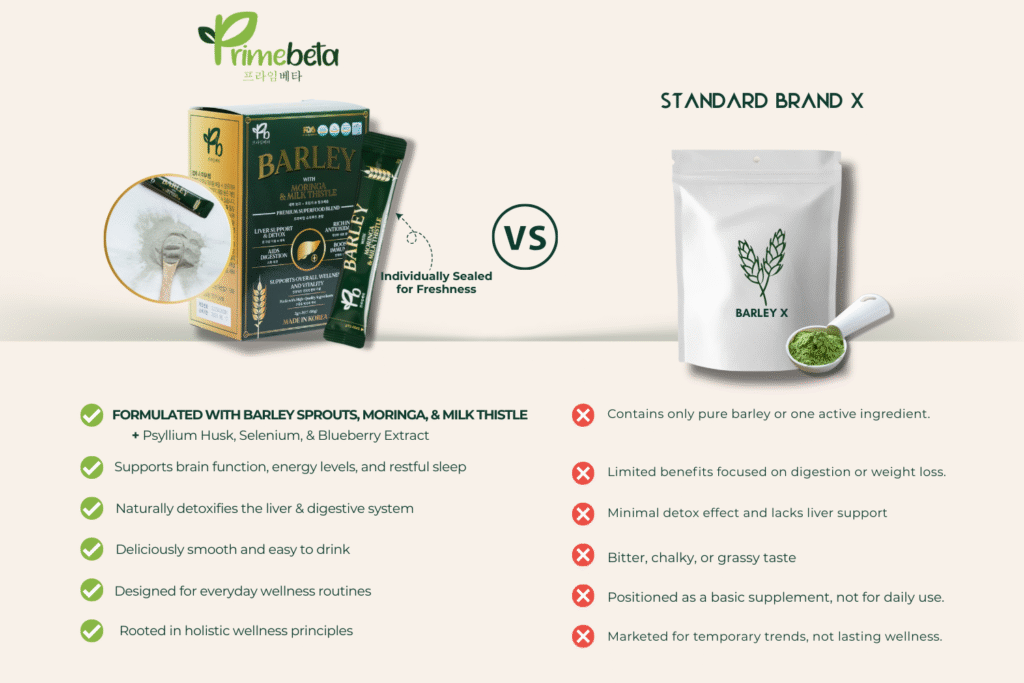 When you drink Primebeta Barley at night, you’re giving your body a natural calming and cleansing formula. The barley sprout, moringa, and selenium promote deeper, more restful sleep, while psyllium, milk thistle, and blueberry stimulate gentle overnight digestion—so you wake up feeling lighter and more refreshed. It’s not a laxative—it’s a natural reset.